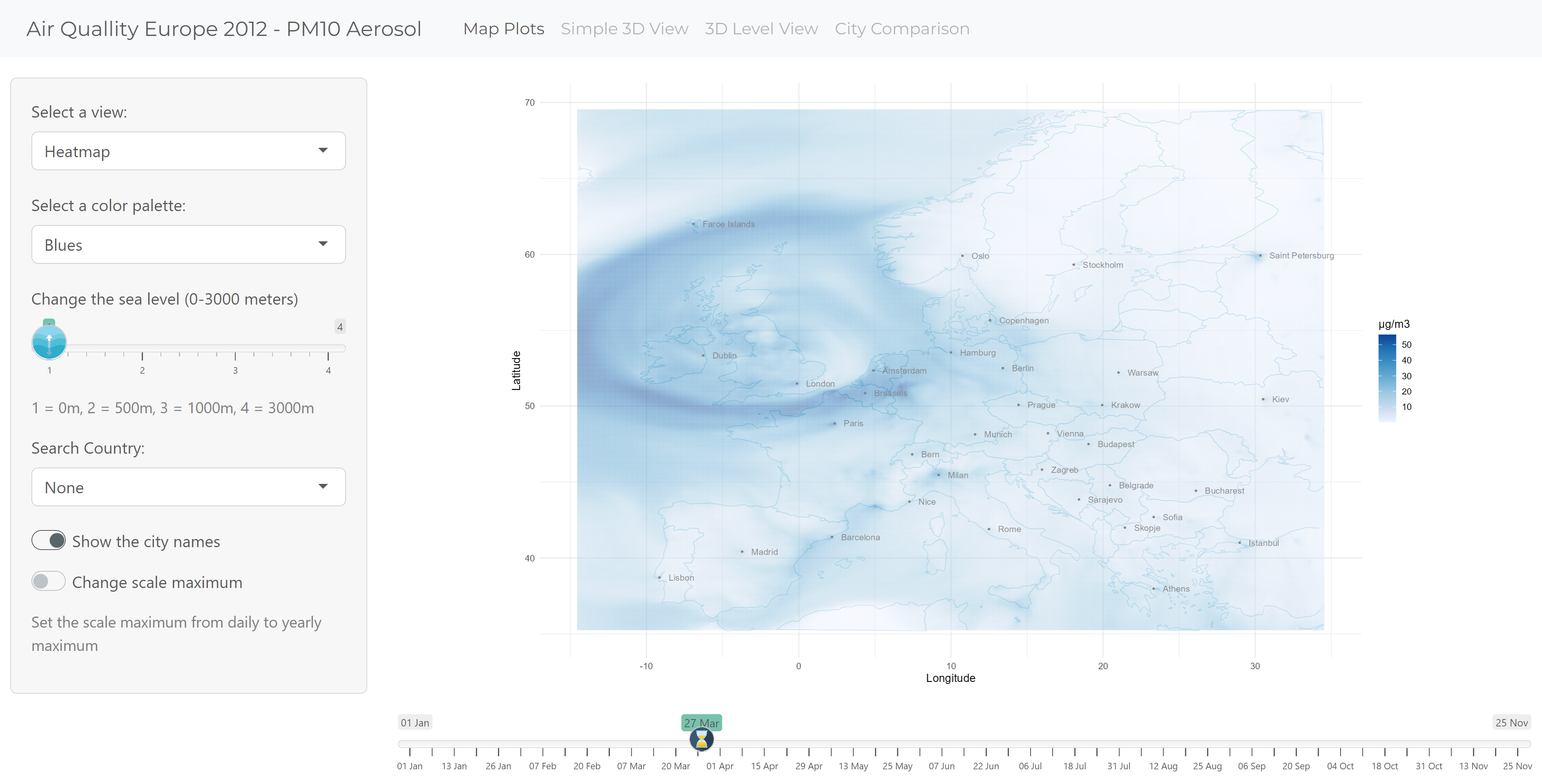 - Explore the air pollution of Europe on 2D map;