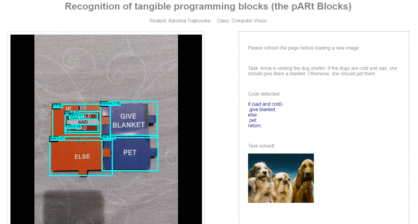 pARt Blocks are physical programming blocks designed to facilitate tangible programming experiences. This project comprises a custom-trained model capable of detecting these blocks, coupled with a React application responsible for compiling the provided program.
